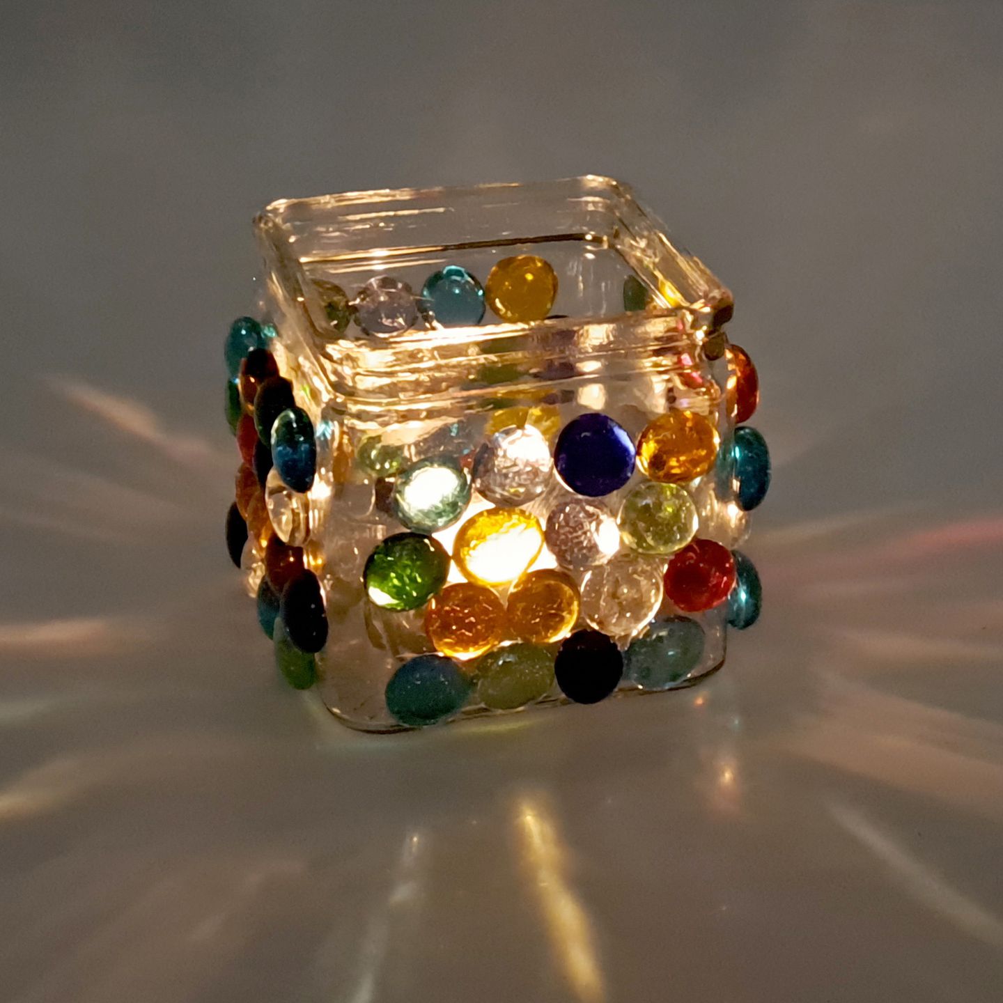 2. Glas hinlegen und Glasstein für Glasnuggets mit Multigelkleber auf dem Kerzenglas festkleben. Der Leim braucht etwas Zeit um zu trocknen, daher jede beklebte Seite für mindestens 1 Stunde trocknen lassen.